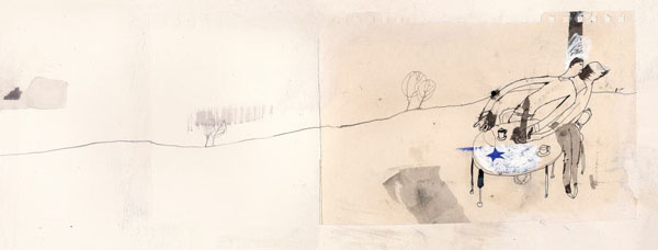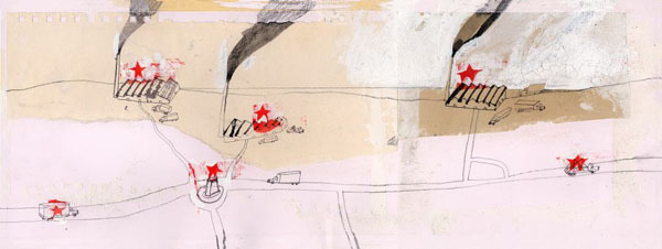 “No milk, no sugar, just coffee” is a story of love interrupted by wartime, told from two perspectives of young lovers- man drafted to war, and his girlfriend who fled the country. Symbol of a star serves as a visual and narrative leitmotif, being the only colorful accent in the otherwise monochromatic illustrations.