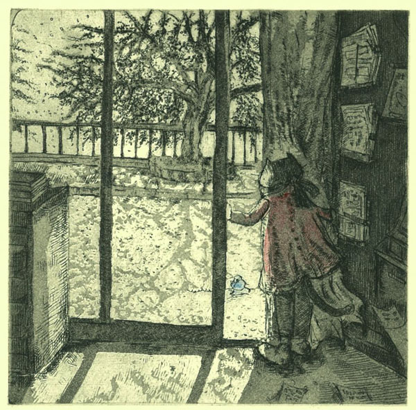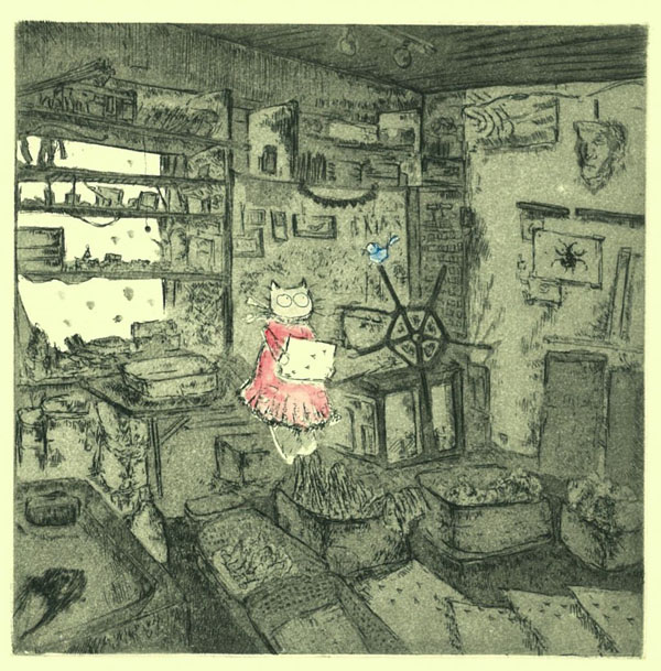 This is the story of a cat and a bird, as it unfolds in a small printmaking studio. The busy cat printmaker asks her bird friend to help create a piece. But the bird, mistaking it for a birthday party, arrived humming and carrying a small present. (Original Zine book).