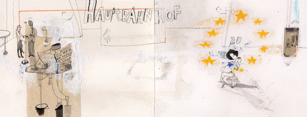 “No milk, no sugar, just coffee” is a story of love interrupted by wartime, told from two perspectives of young lovers- man drafted to war, and his girlfriend who fled the country. Symbol of a star serves as a visual and narrative leitmotif, being the only colorful accent in the otherwise monochromatic illustrations.